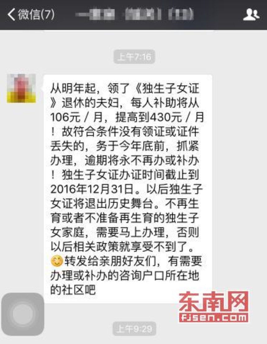 东南网莆田12月22日讯(本网记者 柳烨)今日(22日),有网友向东南网“网络求真”栏目反映,微信流传“明年起,独生子女每月补助将提高到430元,且独生子女办证时间截止于今年年底”。对此,莆田市卫计委工作人员表示,部门目前并未接到上述有关增加奖励费、补办《独生子女证》时间截止等内容的文件。 网上流传的信息称,“从明年起,领了独生子女证的退休夫妇,每人补助将从每月106元,提高到每月430元!故符合条件没有领证或证件丢失的,务必于今年底前,抓紧办理,逾期将永不再办或补办!独生子女证办证时间截止到2016年12月31日……”