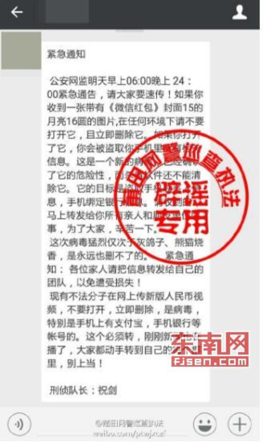 有网友留言反映,称自己收到了一条“公安网监”发布的紧急通告——“如果收到‘祝贺顺丰成功上市’领取红包的信息,在任何环境下不要打开,这是十分厉害的病毒。”该网友表示,因自己和朋友均收到了这样的领取红包信息,担心上当而不敢领取。