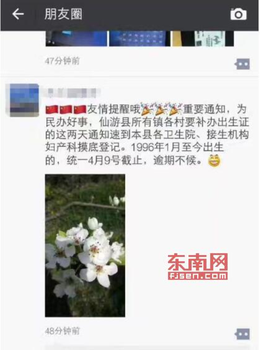 “重要通知:为民办好事,仙游县所有镇各村要补办出生证的,这两天通知速到本县各卫生院、接生机构妇产科摸底登记。1996年1月至今出生的,统一4月9日截止……”4月7日,该条信息在微信朋友圈流传开。