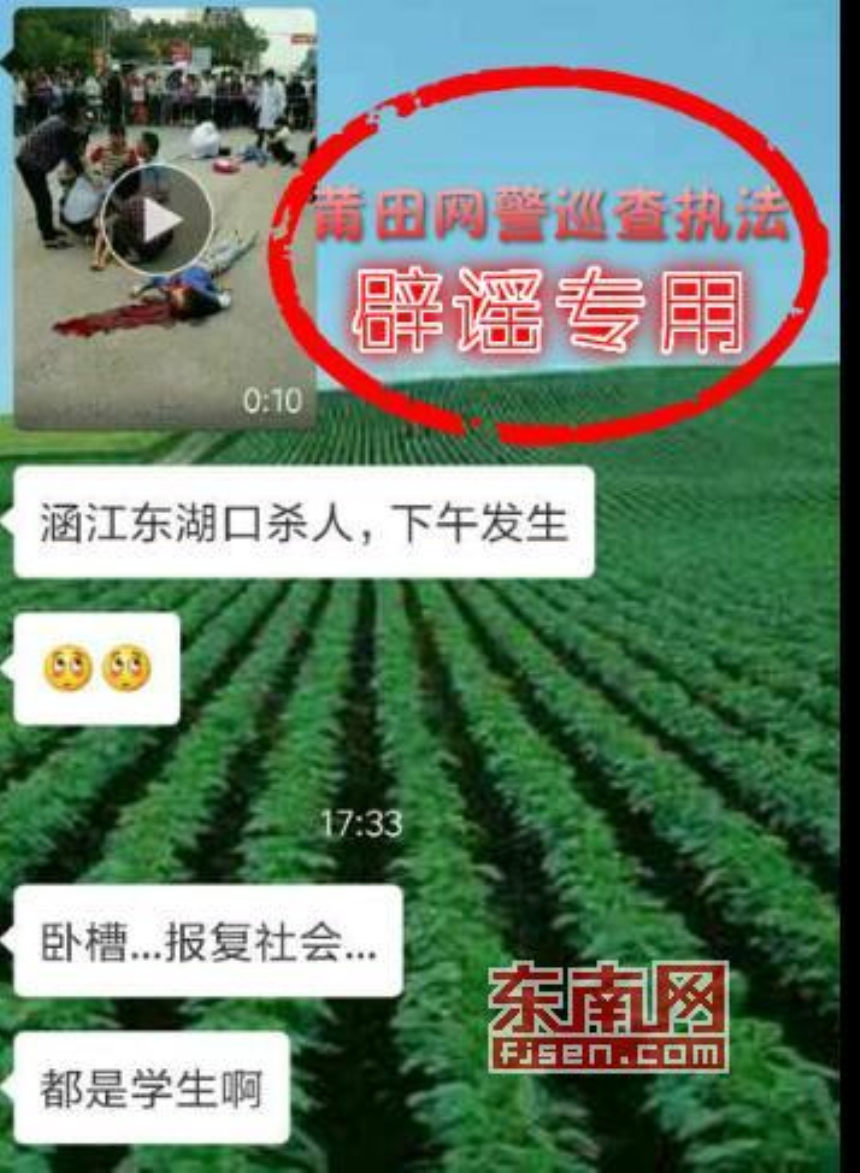 警方表示,事故发生后,现场拍摄的数段视频在网上悄然流传开来,其中一段视频流传到了莆田本地,并被谣传成莆田市涵江区发生了杀人事件。