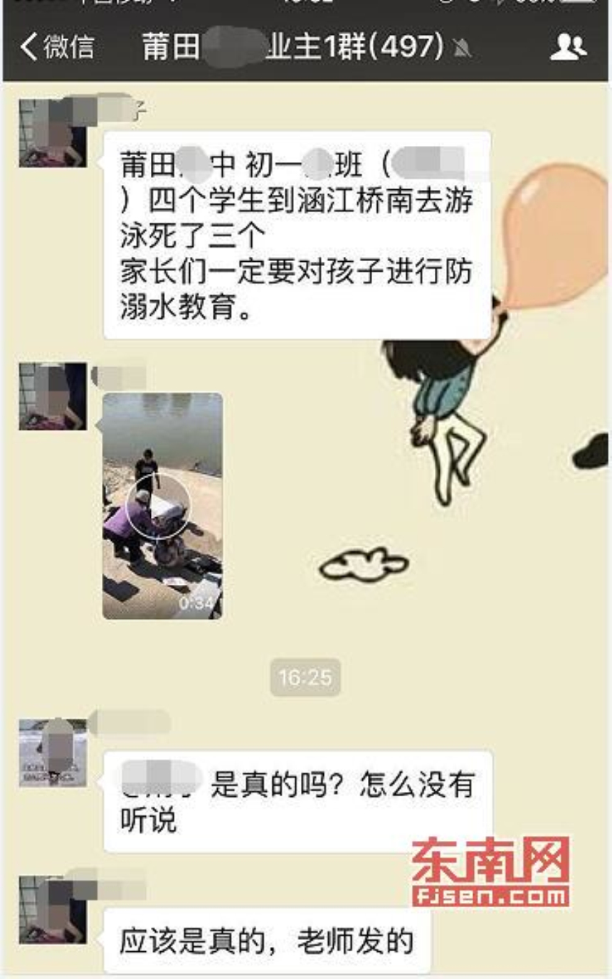 东南网莆田5月15日讯(本网记者 李妙珠)今日(5月15日),一段时长34秒的视频在莆田本地微信群里流传开,画面中有家长在河岸边大声哭嚎。有网友称这是“莆田某学校四学生,下水游泳死了三个”;也有网友说看到的版本是“莆田某中学初一六班四个学生到涵江桥南去游泳死了三个”。东南网记者从莆田市公安局网安支队了解到,该段视频内容并非发生在莆田。