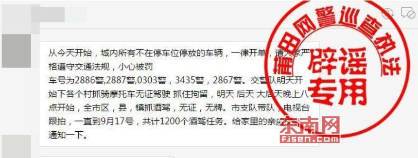 东南网莆田8月14日讯(本网记者 李妙珠 通讯员 黄蕾茹)“从今天开始,城内不按位停放的车辆一律开单……交警队明天开始进村抓摩托车无证驾驶、酒驾……共计1200个酒驾任务。”这是真的吗?东南网“网络求真”栏目记者从莆田市公安局网安支队获悉,经莆田市交警部门证实,该信息为谣言。