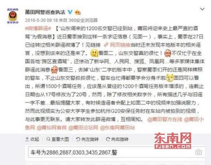 东南网记者从莆田市公安局公共信息网络安全监察支队获悉,经向莆田市交警部门证实该则信息为假。同时,去年5月30日,莆田市公安局网安支队已对类似信息进行辟谣,在经过比对后发现,如今流传的信息的大部分内容都与去年的“山东调来的1200名交警已经到站,莆田将迎来史上最严查的酒驾”谣言一致,连所谓警车的车牌号都一模一样,只是在第一段添加了“从今天开始,城内所有不在停车位停放的车辆,一律开单”的内容。此外,根据公安部相关要求,交管部门不会给执勤民警下达查处酒驾或罚款指标。