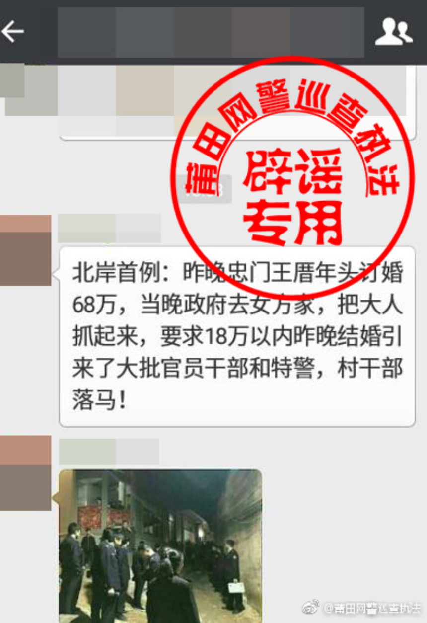 东南网莆田12月1日讯(本网记者 李妙珠 通讯员 黄蕾如)近日,网传莆田北岸忠门镇一村民因聘金太高引来了大批部门干部和特警,结果村民房子被拆。东南网“网络求真”栏目记者今日从莆田市网安支队获悉,经核实,该网传内容系谣言。 根据网友提供的网传信息显示:“北岸首例,昨晚忠门王厝年头订婚68万(元),当晚,政府去女方家,把大人抓起来,要求18万(元)以内,昨晚结婚引来了大批官员干部和特警,村干部落马!”“昨晚在忠门听到有一家聘金30.8万刚办的订婚酒,政府就上门处理,还把人家房子都拆了……”