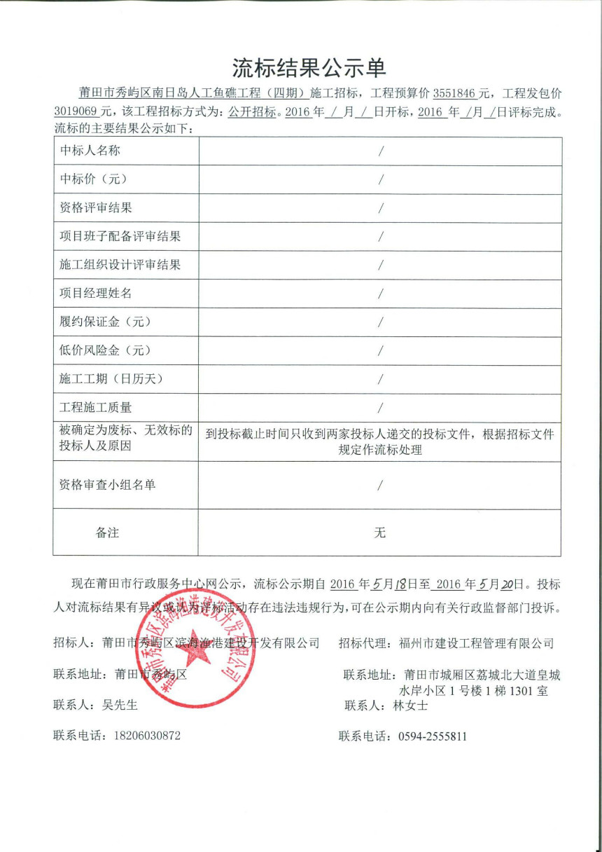 莆田市秀屿区南日岛人工鱼礁工程(四期)流标结果公示