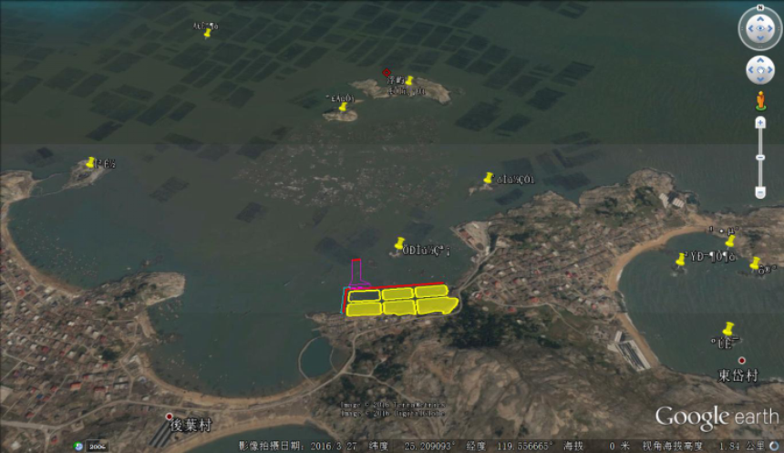 项目概况:本项目拟在东岱村北侧海域,依托后方护岸填海造地,形成总面积约4.72公顷,近似东西走向的陆域。陆域上布置有冷藏加工区、综合管理区、仓储管理区、卸渔区、堆场及晒网区等功能区。陆域前沿拟建码头及护岸全长447m,其中码头位于陆域西北侧,呈西南~东北走向,长66.4m,码头顶高程5.00m;北护岸位于陆域东北侧,长261.1m,西护岸位于陆域西侧,长119.5m,护岸前沿顶高程5.00m。项目用海部分位置如下图所示: