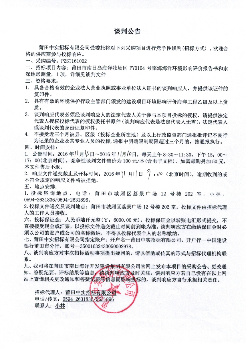 南日岛海洋牧场区PY0104号宗海竞争性谈判邀请公告