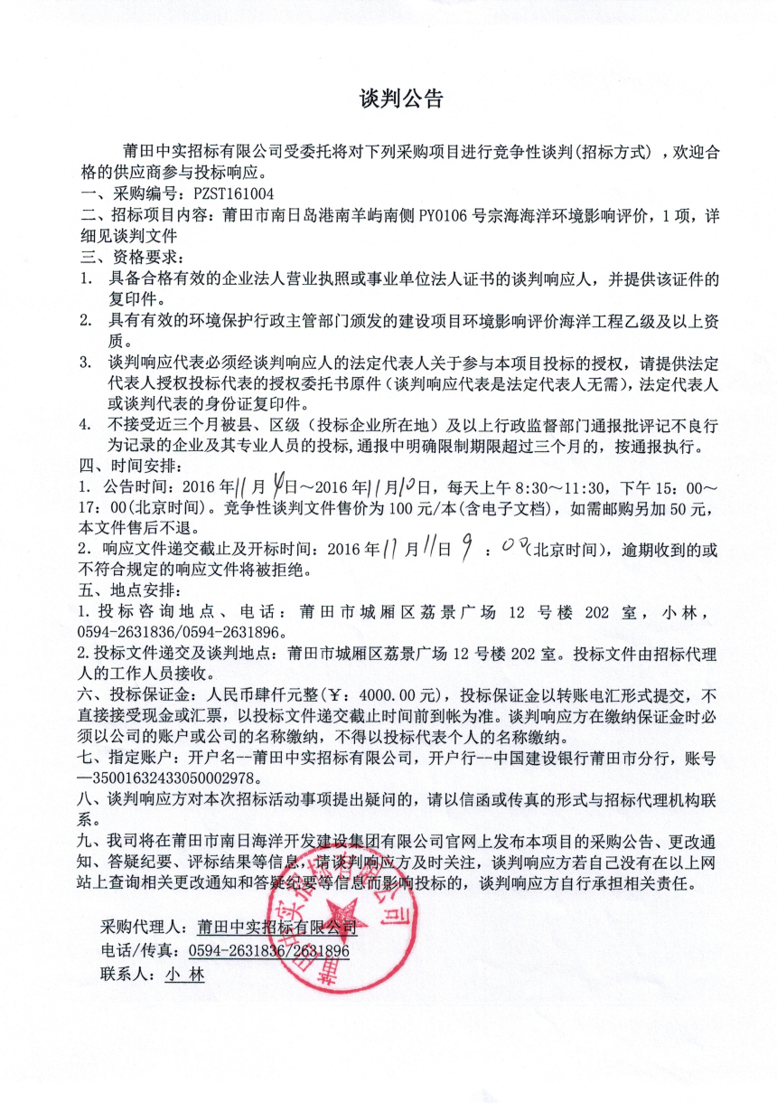 南日岛港南羊屿南侧PY0106号宗海竞争性谈判邀请公告