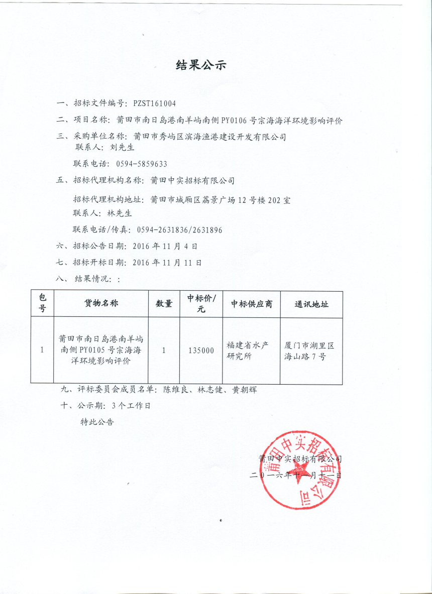南日岛港南羊屿南侧PY0106号宗海海洋环境影响评价中标公告