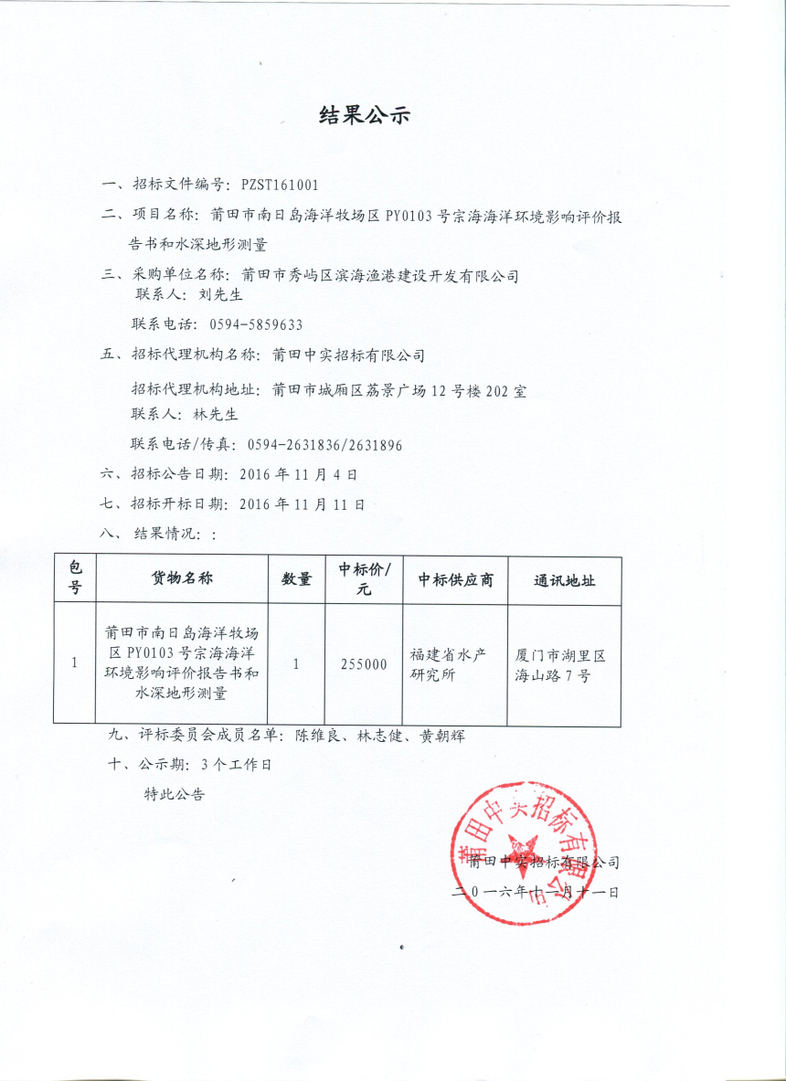 南日岛海洋牧场区PY0103号宗海海洋环境影响评价报告书和水深地形测量中标公告