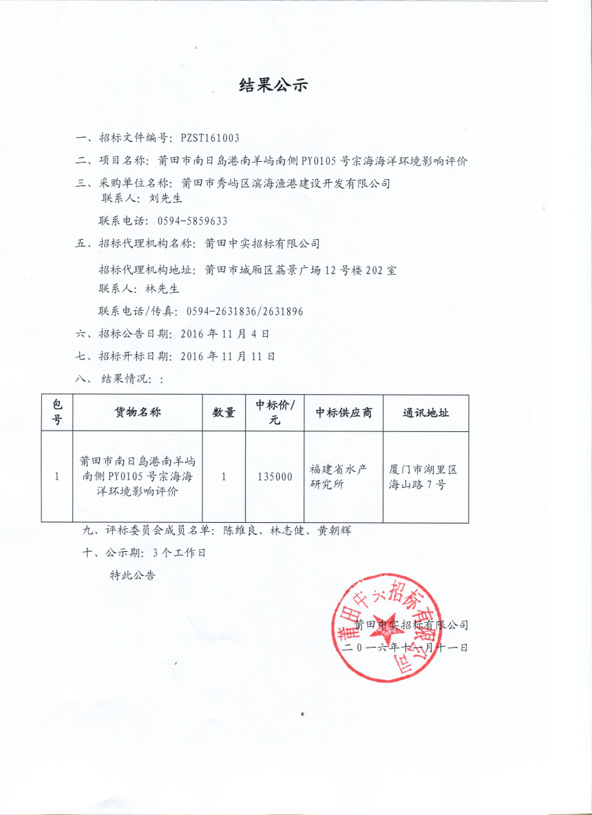 南日岛港南羊屿南侧PY0105号宗海海洋环境影响评价中标公告