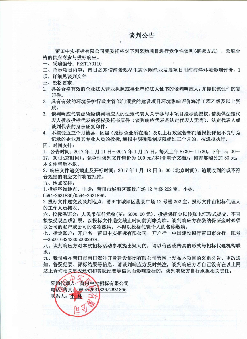 关于南日岛东岱湾景观型生态休闲渔业发展项目用海海洋环境影响评价的谈判公告