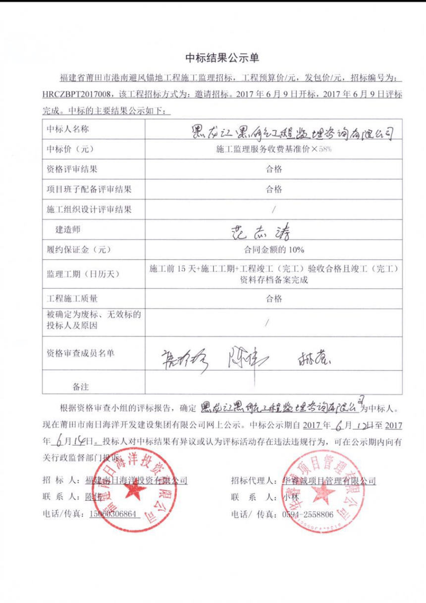 福建省莆田市避风锚地项目监理单位中标公示