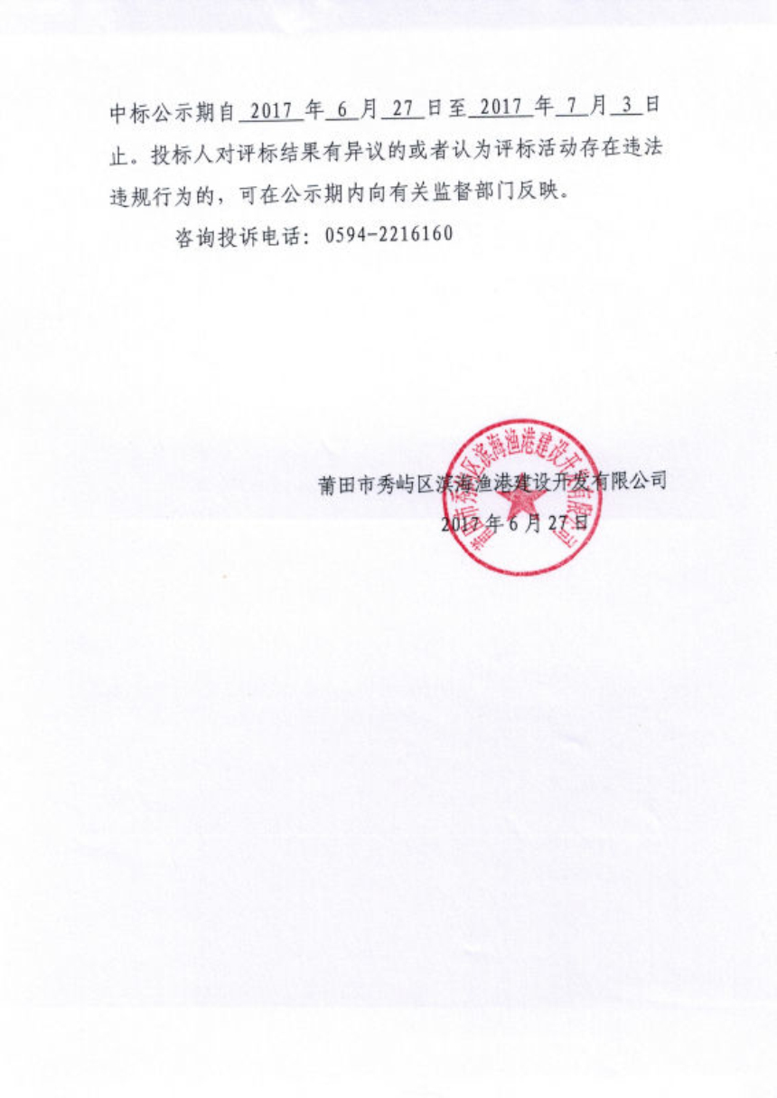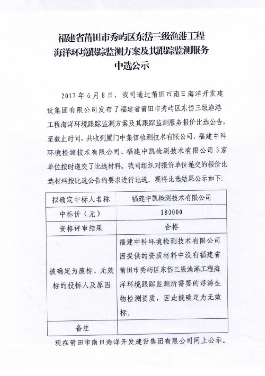 福建省莆田市秀屿区东岱三级渔港工程海洋环境跟踪监测方案及其跟踪监测服务中选公示
