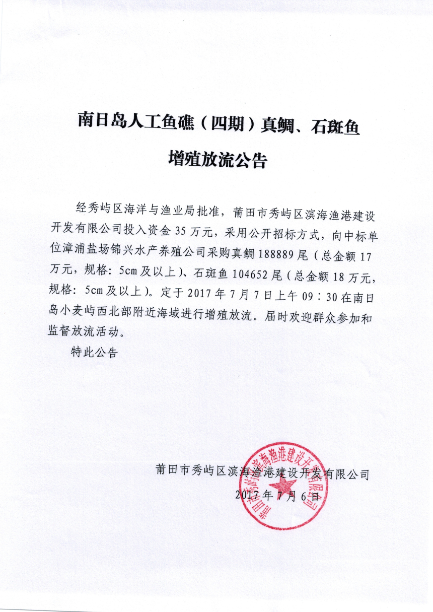 南日岛人工鱼礁(四期)真鲷、石斑鱼增殖放流公告