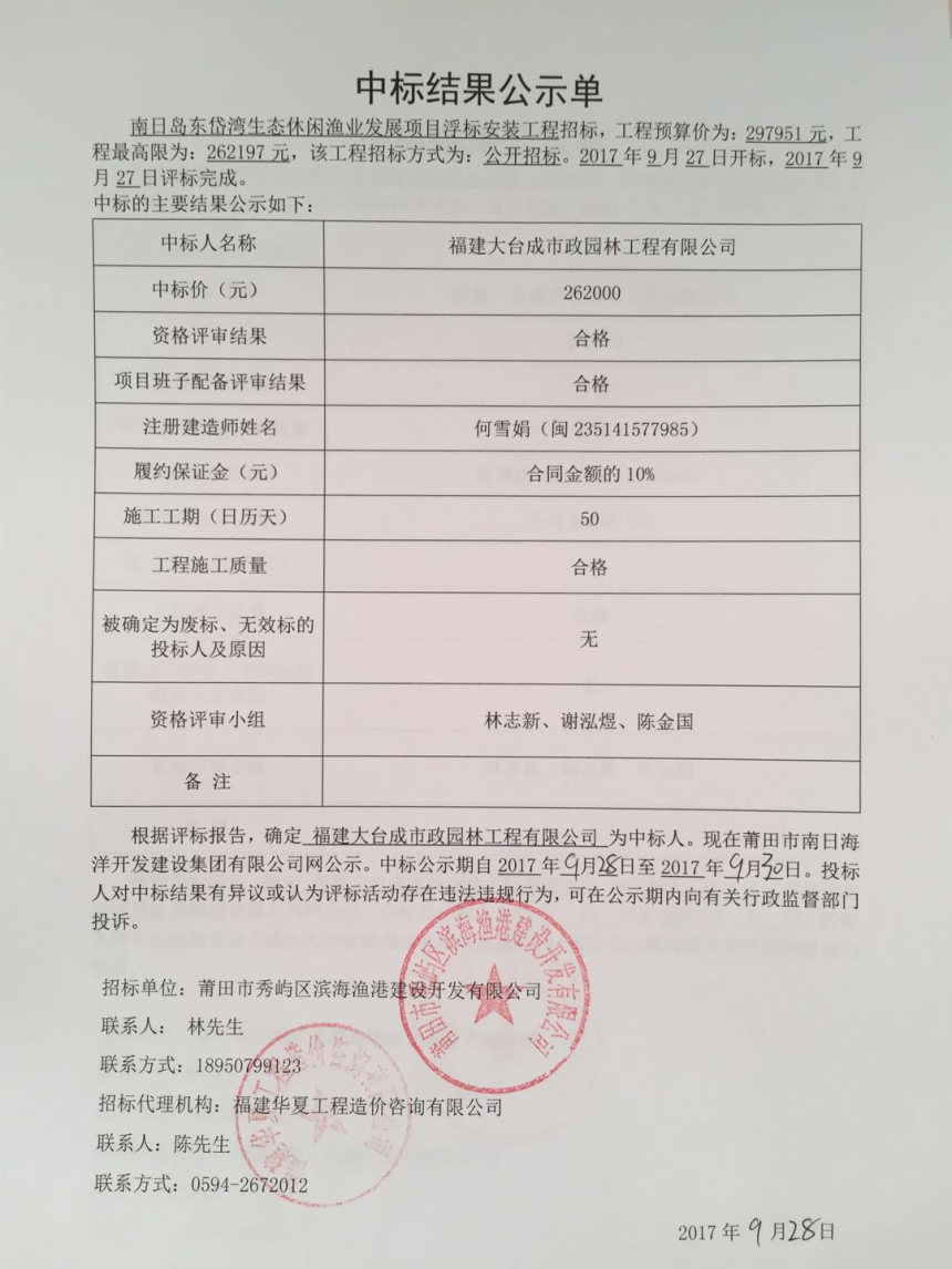南日岛东岱湾生态休闲渔业发展项目浮标安装工程中标单位公示单