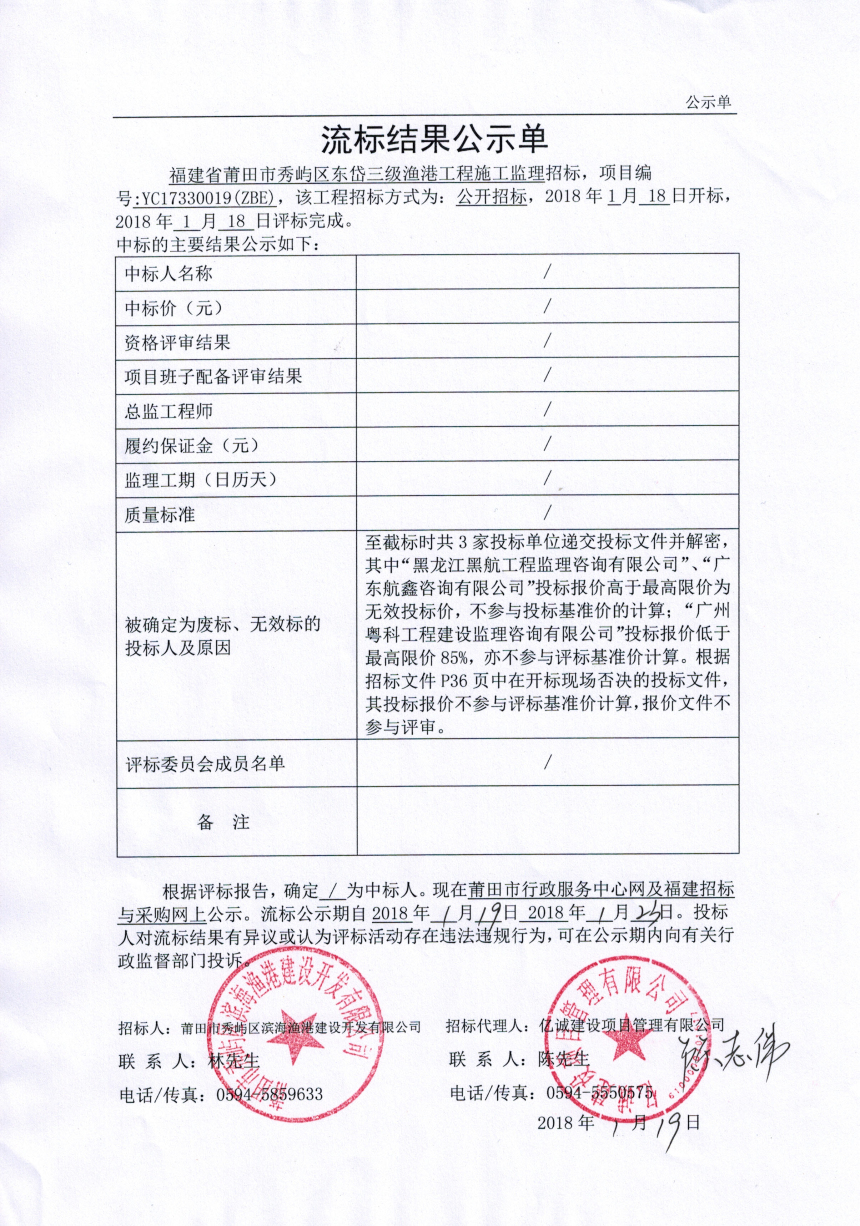 福建省莆田市秀屿区东岱三级渔港工程施工监理流标结果公示单