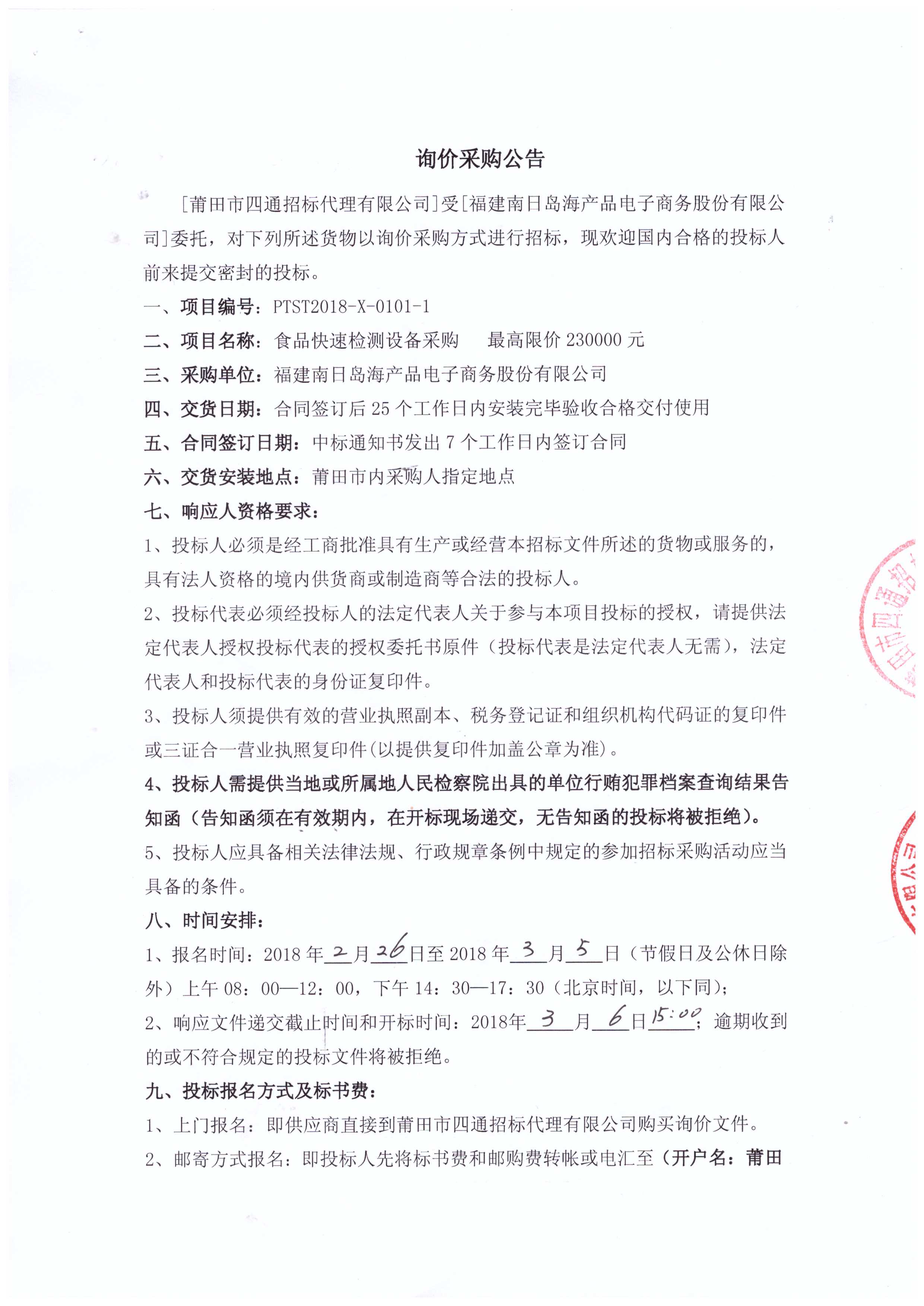福建南日岛海产品电子商务股份有限公司食品快速检测设备采购公告
