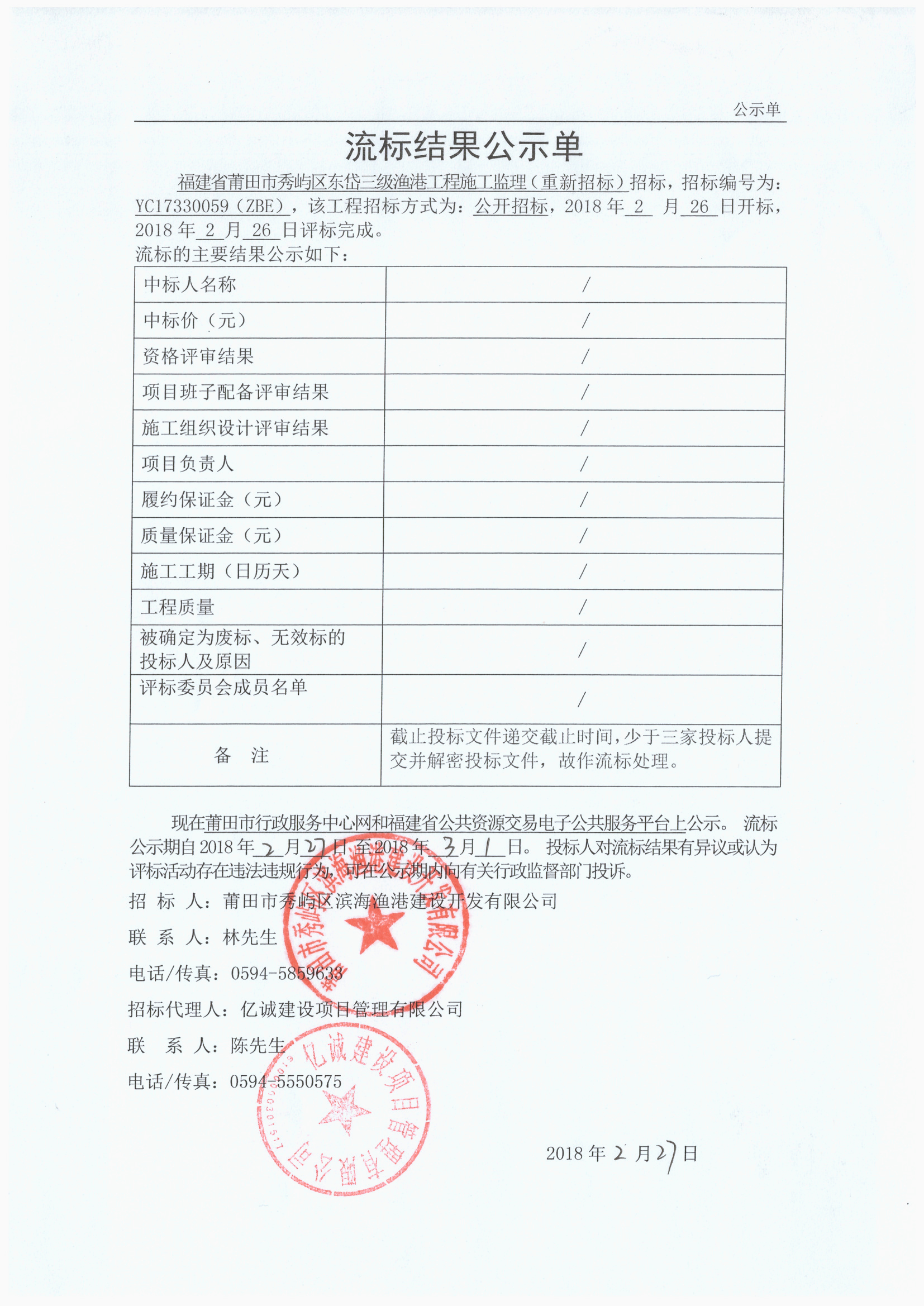 福建省莆田市秀屿区东岱三级渔港工程施工监理 (重新招标)流标结果公示单