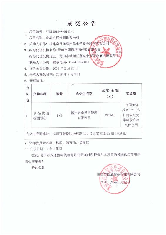 福建南日岛海产品电子商务股份有限公司关于食品快速检测设备采购的成交公告