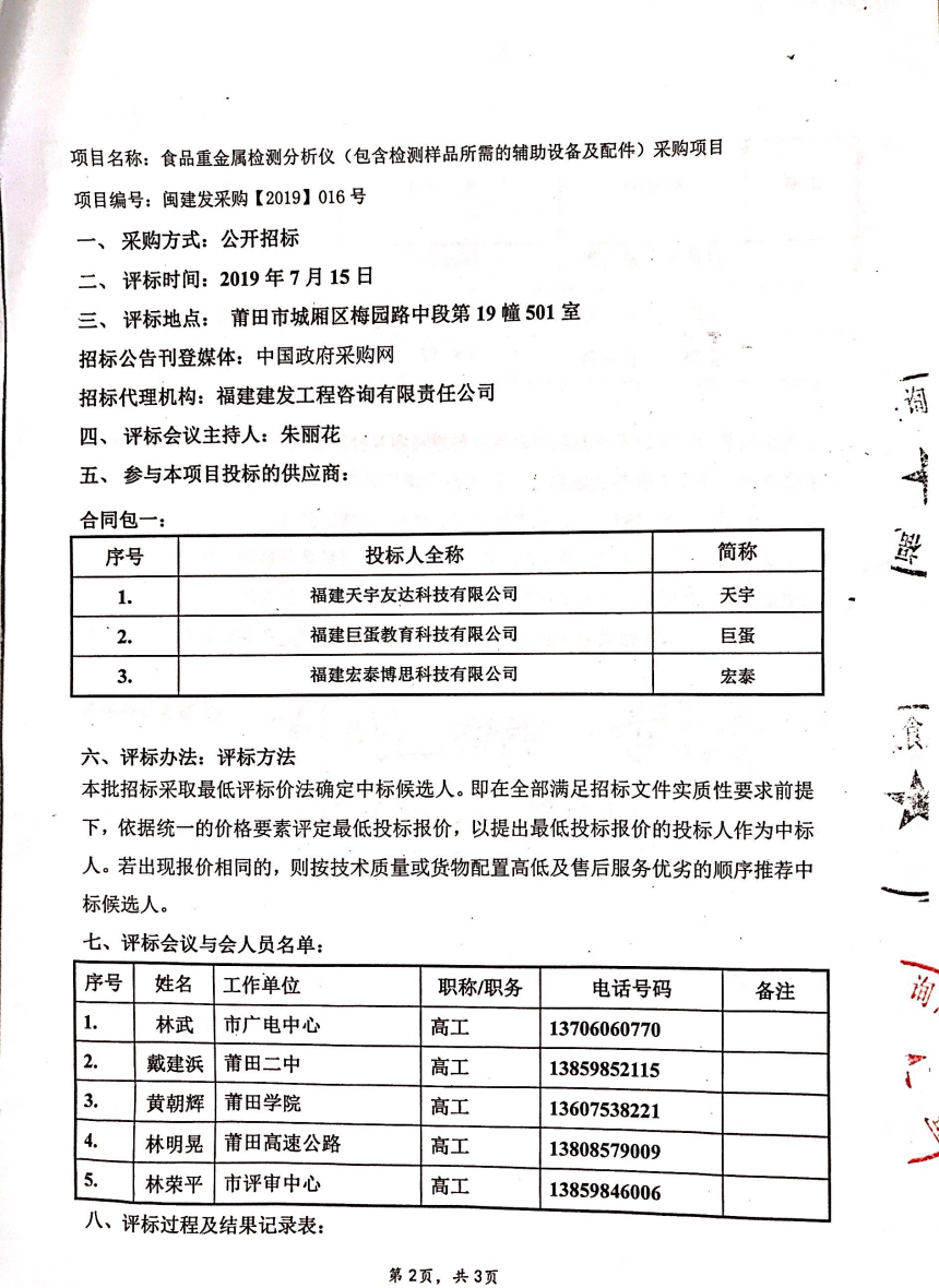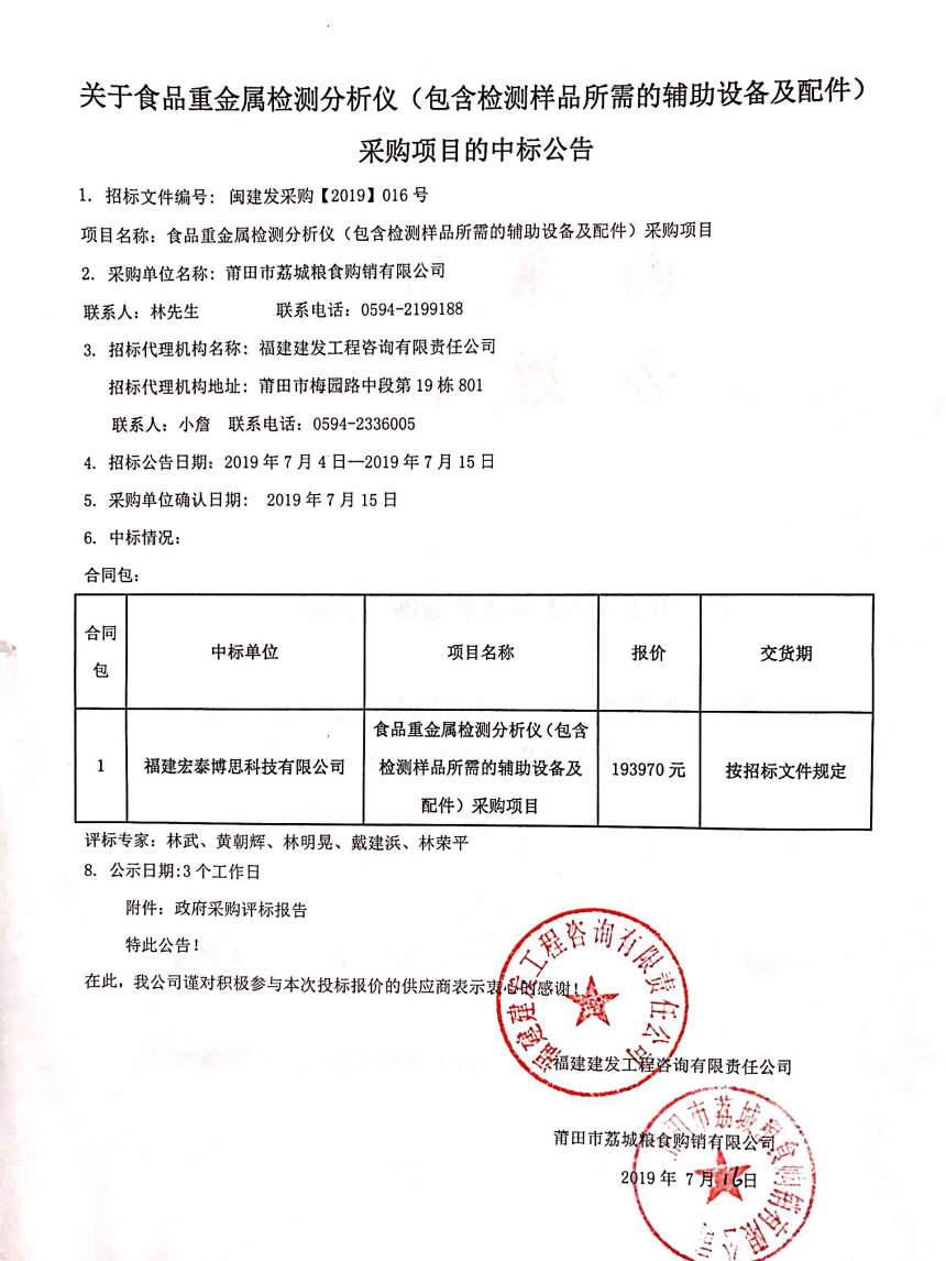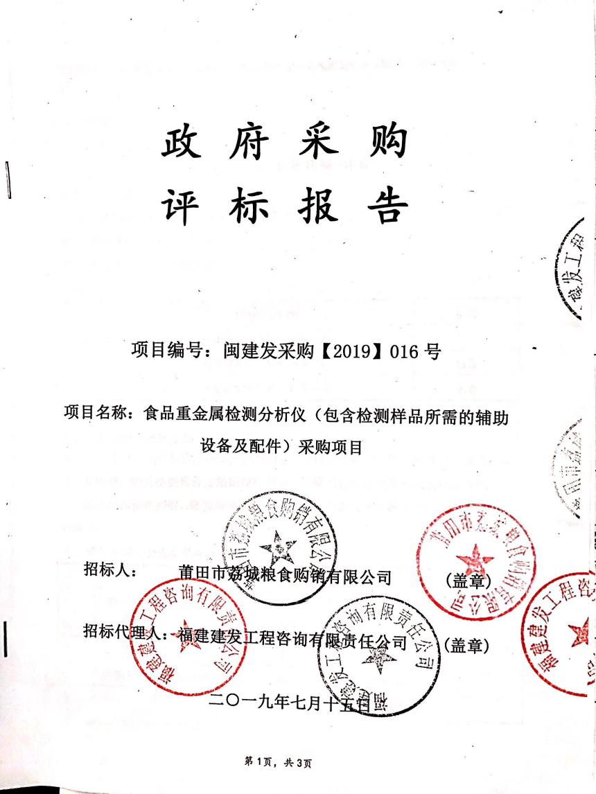 莆田市荔城粮食购销有限公司食品重金属检测分析仪(包含检测样品所需的辅助设备及配件)采购项目的中标公告