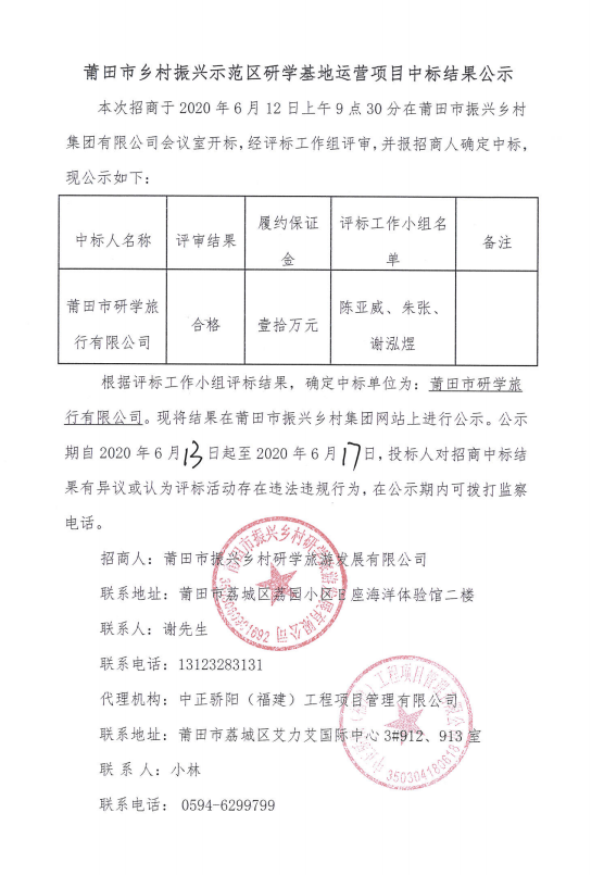 莆田市乡村振兴示范区研学基地运营项目中标结果公示