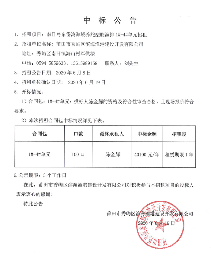 南日岛东岱湾海域养鲍塑胶渔排1#-4#单元招租中标公告