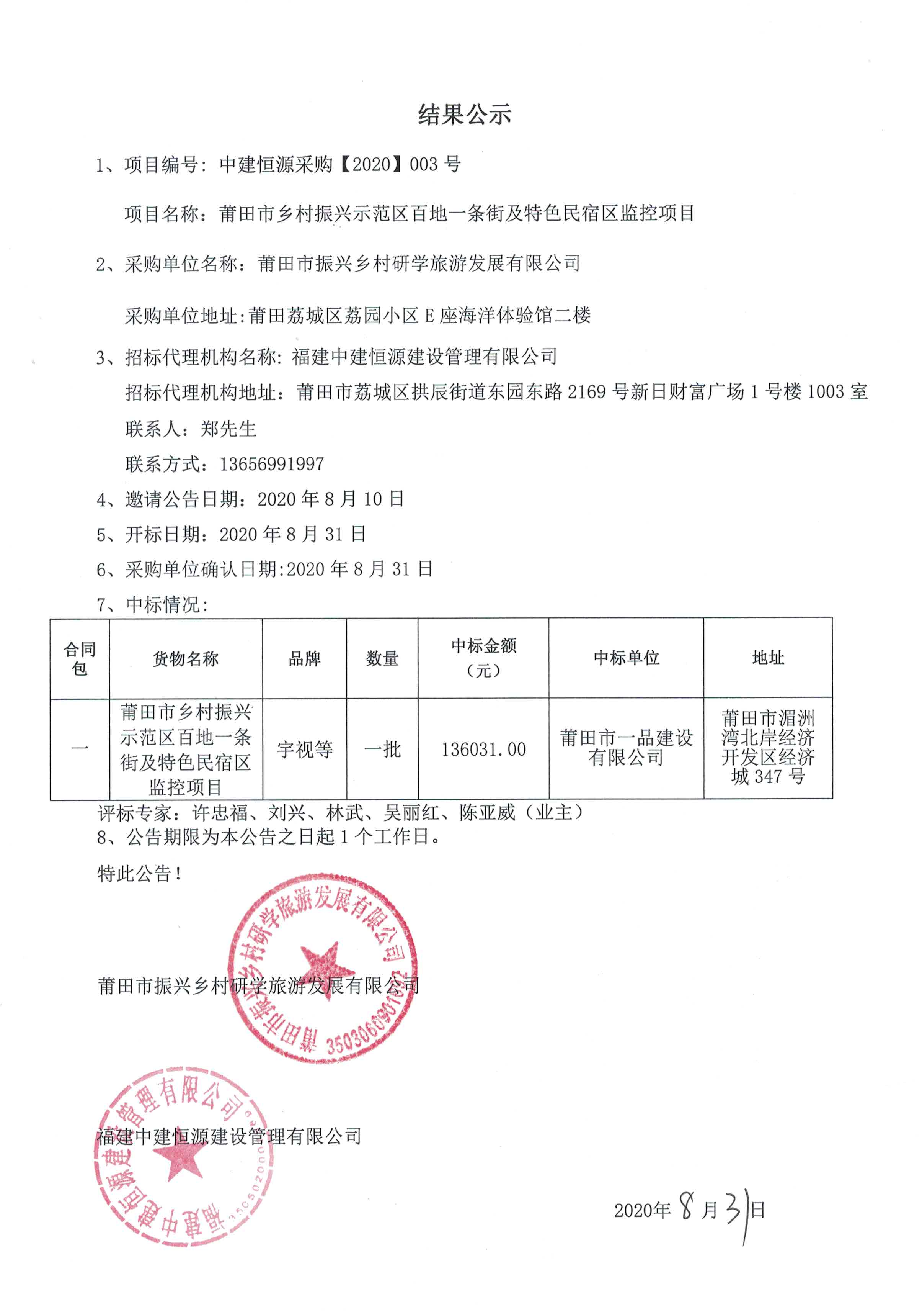 莆田乡村振兴示范区百地一条街及特色民宿区监控项目中标结果公告