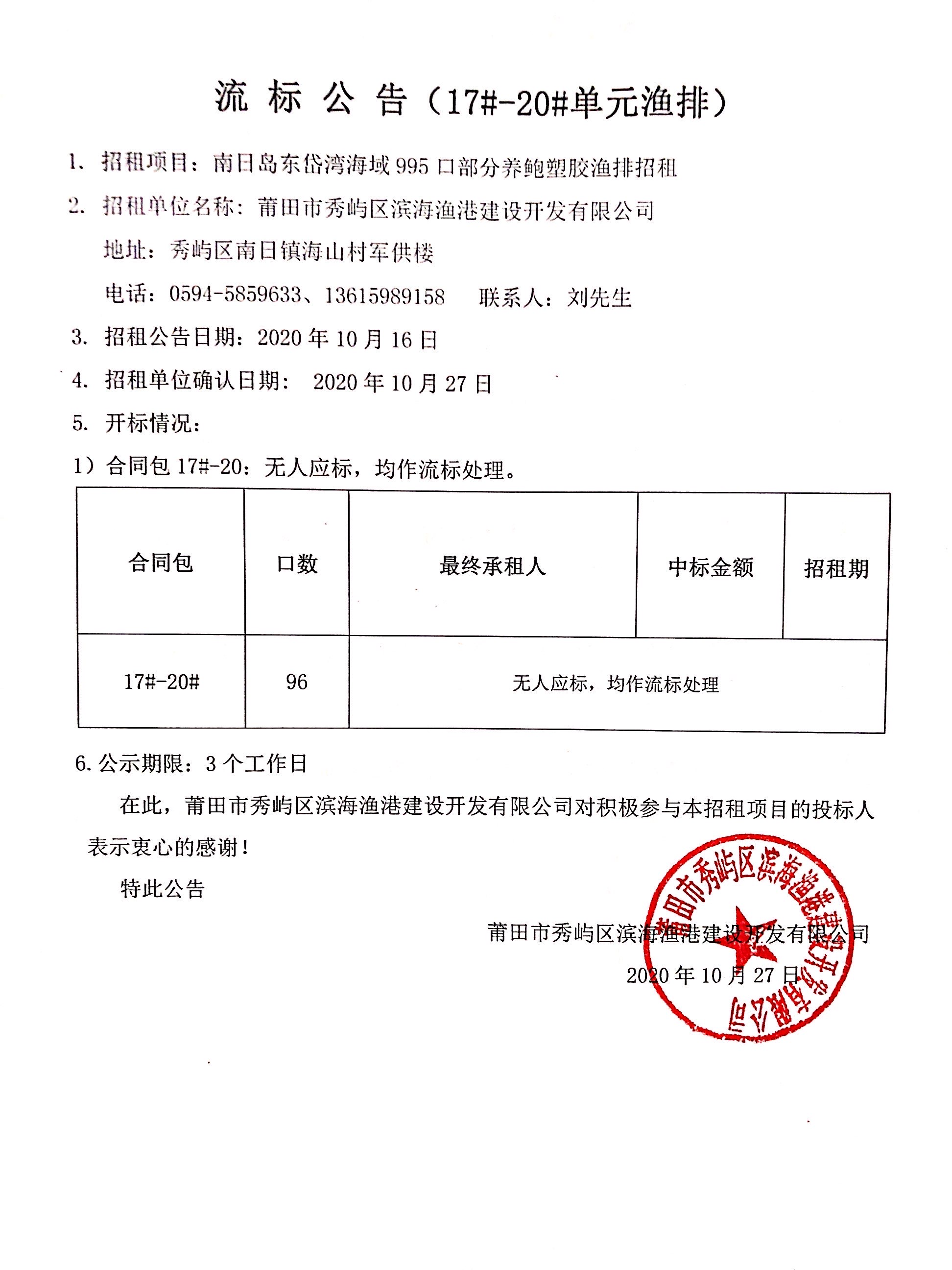 南日岛东岱湾海域995口部分养鲍塑胶渔排招租情况公告(十)(17#-20#单元渔排流标公告)
