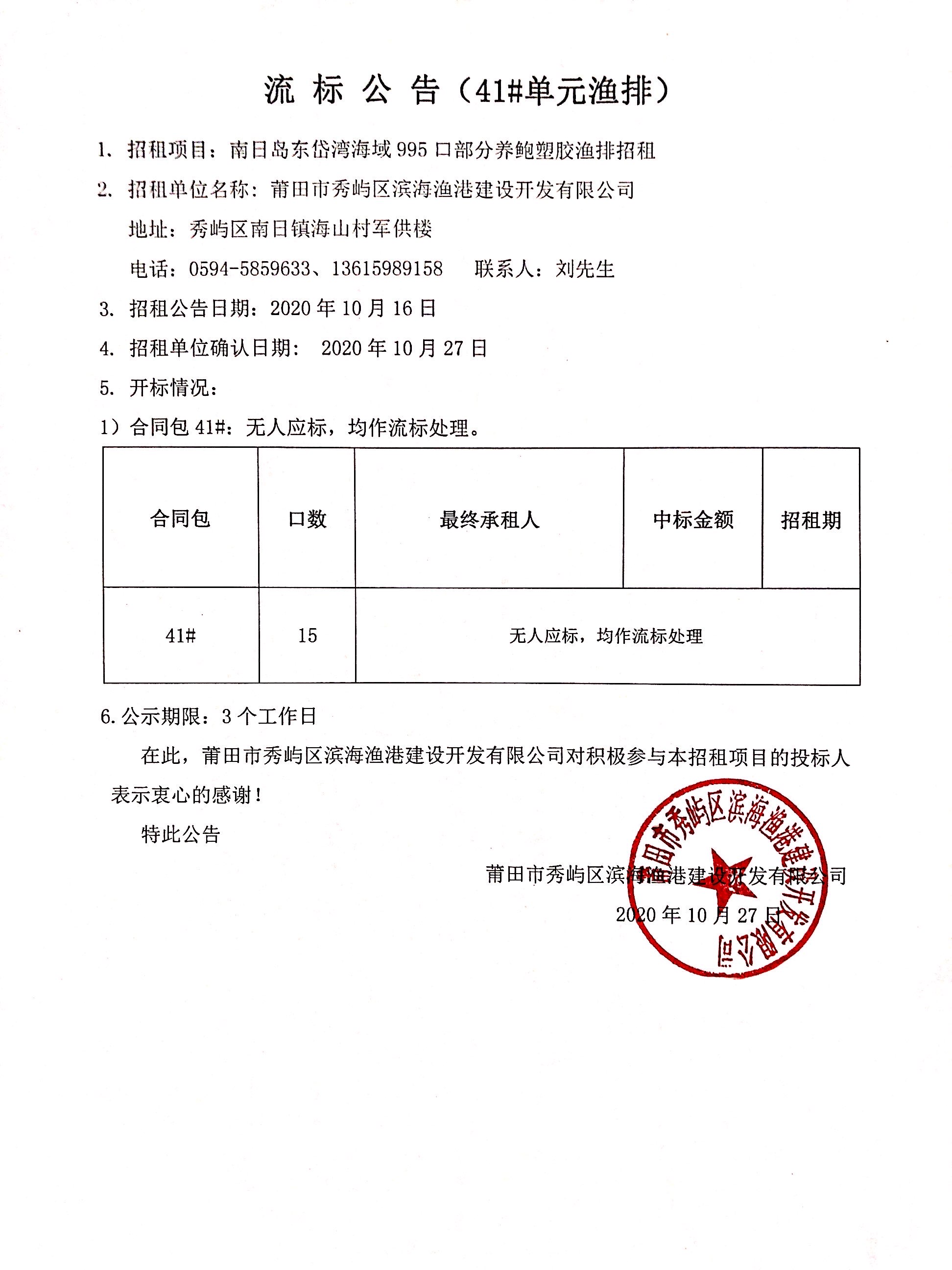 南日岛东岱湾海域995口部分养鲍塑胶渔排招租情况公告(九)(41#单元渔排流标公告)