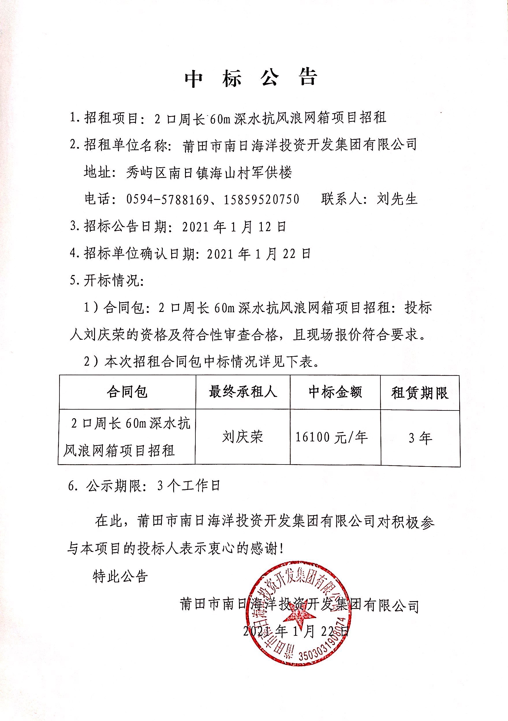 2口周长60m深水抗风浪网箱招租中标公告