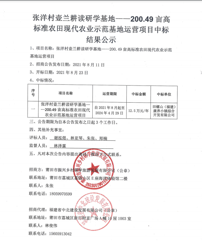张洋村壶兰耕读研学基地——200.49亩高标准农田现代农业示范基地运营项目中标结果公示