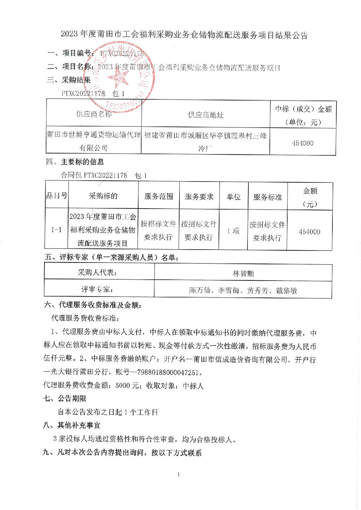 2023年度莆田市工会福利采购业务仓储物流配送服务项目结果公告