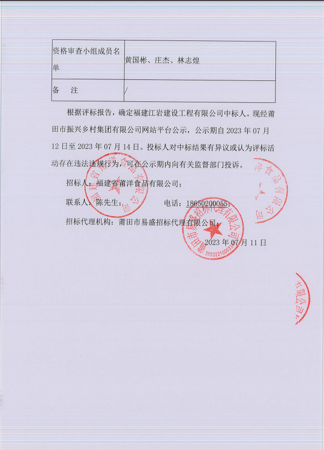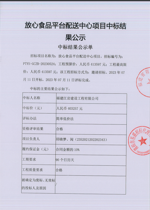 放心食品平台配送中心项目中标结果公示