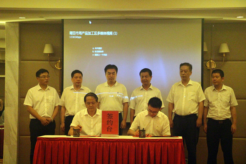 仪式上,省国资公司党委委员、副总经理龚兴秋与莆田市海洋开发投资有限公司总经理王新芳签订了《渔港项目合作协议书》和《海产品加工区合作协议书》。