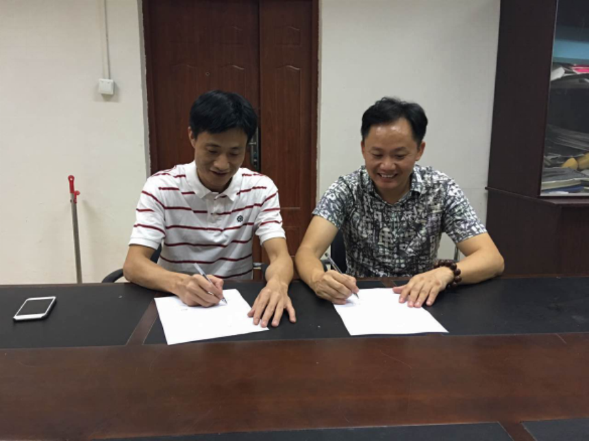 ![]() 图为福建南日岛海产品电子商务股份有限公司副总经理谢静海(左)与福建越特新材料科技有限公司董事长许明洪(右)的签单现场