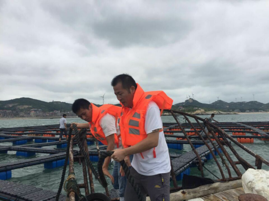 ![]() 14号超强台风“莫兰蒂”前,南投公司负责人带领相关人员到海上检查塑胶渔排,并做好加固工作。