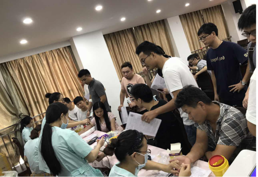 活动中,志愿者们按照流程依次填表、量血压、验血型、抽血,