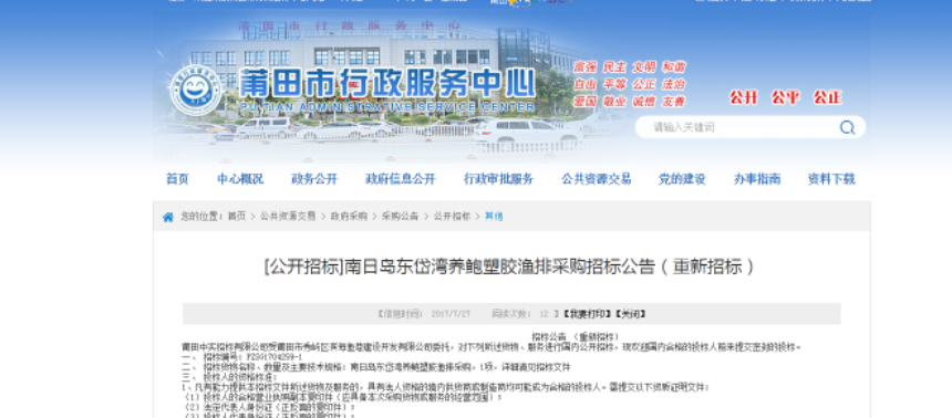 7月27日,南日岛东岱湾养鲍塑胶渔排采购重新招标公告在莆田市行政服务中心、集团网站和集团微信公众号上发布。
