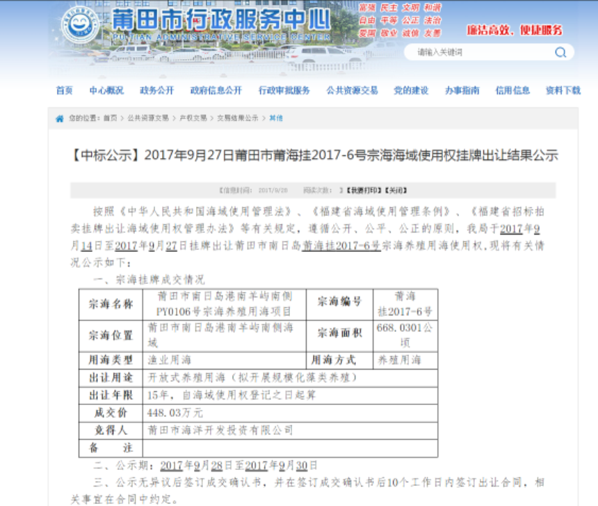 9月27日,我集团继2015年之后,再次竞得2宗养殖用海海域使用权,总海域面积为1336.0623公顷,总成交价值896.06万元,出让期限为15年。