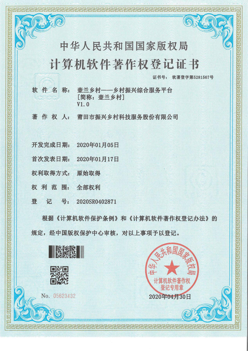 近日,根据《中华人民共和国计算机软件保护条例》和《计算机软件著作权登记办法》的规定,经中华人民共和国国家版权局审定,由黑料不打烊 科技服务公司委托开发并实施应用的“壶兰乡村”乡村振兴综合服务平台获得国家版权局计算机软件著作权授权。(软件名称:“壶兰乡村——乡村振兴综合服务平台[简称:壶兰乡村]V1.0,证书号为:软著登字第5281567号)。这是黑料不打烊 成立以来的首个软件著作权科技成果。 该平台针对莆田市三农需求,建设涵盖土地流转、农机农资共享、电子商务、乡村文旅、放心食品供应、农村商学院、科技特派员、生猪产业监管等服务内容,全面提升农业产业发展的精准服务能力,实现服务一站式,管理一条龙目标。 此项软件著作权的获得是集团近年来重视信息化建设、注重知识产权保护取得的一项重大突破。下一步,“壶兰乡村”平台技术团队将紧跟时代步伐,依托现代化技术发展,立足企业与行业,着力发挥信息技术创新的扩散效应、信息和知识的溢出效应、数字技术释放的普惠效应,向建设莆田市数字乡村目标奋力迈进。