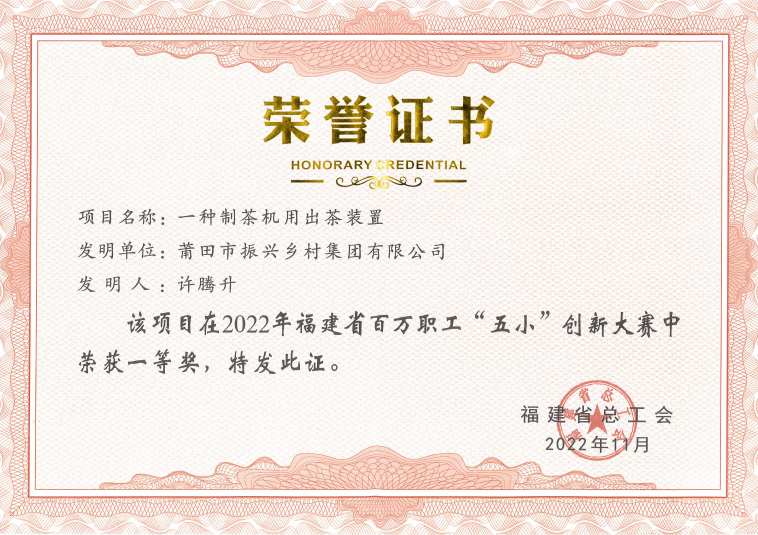 近日,福建省总工会公布了2022年福建省百万职工“五小”创新大赛优秀成果和优秀组织单位名单,经逐级推荐和评委会专家评审,黑料不打烊 旗下子公司福建省莆洋食品有限公司职工许腾升报送的《一种制茶机用出茶装置》喜获大赛一等奖。 福建省百万职工“五小”创新大赛是福建省总工会在全省企事业单位中广泛开展以“小革新、小发明、小创造、小设计、小建议”为主要内容的“五小”竞赛活动,旨在更好地发挥广大职工在推进企业持续发展进程中的主力军作用,进一步激发广大职工的创新意识,挖掘培养技术技能人才。