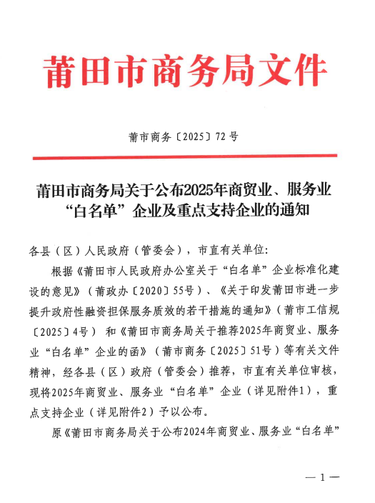 近期,莆田市商务局发布2025年商贸业、服务业“白名单”企业及重点支持企业,莆田市木兰惠生活服务公司及下属子公司莆田市鹰发劳务派遣服务有限公司(已更名为“莆田市木兰人力资源有限公司”)、莆田市鲤兴物业管理有限公司成功入选“白名单”企业。 木兰惠生活服务公司及下属子公司坚持聚焦现代服务主责主业,积极承接莆田市各企事业单位档案、安保、物业、劳务外包、食堂、资产运营等服务业务,拓展形成了档案管理、安保服务、物业管理、劳务派遣、餐饮服务、房产租赁等六大主营业务板块。公司以优质、专业、高效的服务,不断扩大业务市场覆盖面、打造优质服务品牌,推动实现了公司跨越式发展。 入选“白名单”企业这一殊荣不仅是对公司过往成绩的高度认可,更是对未来发展的有力鞭策。木兰服务公司将以此入选为契机,坚持新常态视野和创新思维,立足公司业务多元化优势,抢抓机遇,围绕建立标准化、规范化的“木兰服务”品牌标准、着力打造“一站式”现代服务模式示范企业,构建"基础服务+增值服务+科技赋能"全场景服务生态,推动企业转型智慧城市服务运营商和现代城市服务平台集成商,为行业的发展贡献更多力量,以更优异的成绩回馈社会各界的支持与厚爱。