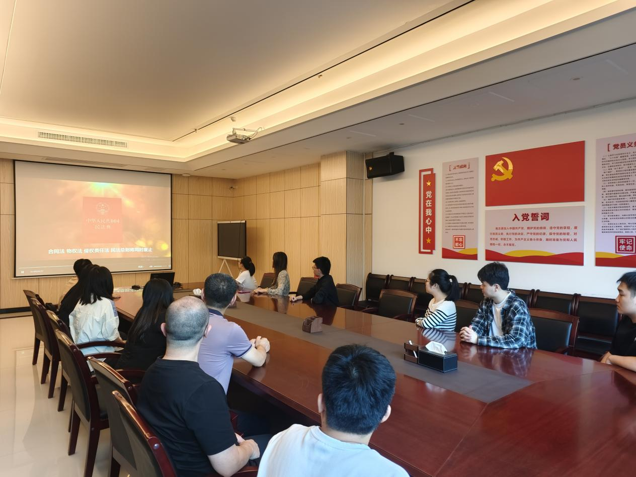 《民法典》作为“社会生活的百科全书”,不仅关乎个人权益,更为企业经营管理提供了法律遵循。宣传月期间,聚焦《民法典》如何赋能国企法治建设,组织员工通过视频学习《民法典》,宣传合同履行、知识产权保护及公司法等条款,筑牢风险防线,为国有资产安全和企业可持续发展保驾护航。 创新宣传载体,多形式普法宣传 利用微信工作群及公众号,转发分享民法典相关知识案例,以案释法强化实效;张贴主题海报和横幅,利用办公区LED 屏幕滚动播放民法典普法宣传片及普法知识,提高普法的吸引力和感染力;开展民法典知识测试,参与率达100%,优秀率超95%,以考促学检验成效,进一步加深员工对法律条文的理解。