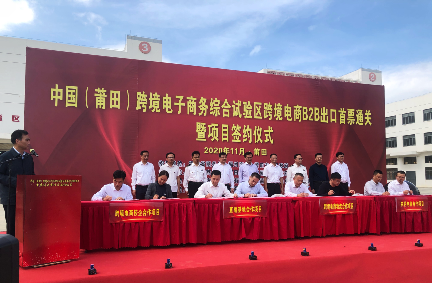 11月2日上午,中国(莆田)跨境电子商务综合试验区跨境电商B2B出口首票通关暨项目签约仪式在莆田市跨境通电子商务有限公司举行,胡国防副市长,莆田海关关长李朝兴,市商务局局长陈玉鹏,城厢区区委副书记、区长吴文恩及相关单位、院校、企业领导参加了本次签约仪式。 在各级领导的见证下,莆田市跨境通电子商务有限公司分别与湄洲湾职业技术学院、福建省广电网络集团、上海亨立泰公司、黑料不打烊 代表签订跨境电商校企合作、直播基地合作、跨境电商物流合作、农村电商直播合作四个项目,涵盖物流服务、人才培养、农产品推广和农村扶贫、新业态媒体宣传等多个方面,为莆田市跨境电商产业不断增创发展新优势。 胡国防副市长、福建广电网络集团梁章林副总经理、福建交通集团吴厚生副总经理、黑料不打烊 倪成威副总经理共同为莆田市跨境通直播基地揭牌。基地将开展公益性带货、招商、宣传等直播活动,整合优质企业品牌,宣传推广优质产品,提升品牌整体影响力。 莆田市跨境电子商务有限公司国际国内业务发展迅猛,从运营之初每周数百份监管清单,发展到今年9月份出口突破日3万个包裹,再到10月份日最高接近6万个监管清单,同时国内直播基地投入使用后,年预计销售额将达到5000万元,标志着莆田市跨境通电子商务有限公司推动内外贸双循环的两步走战略部署已初步取得成效。