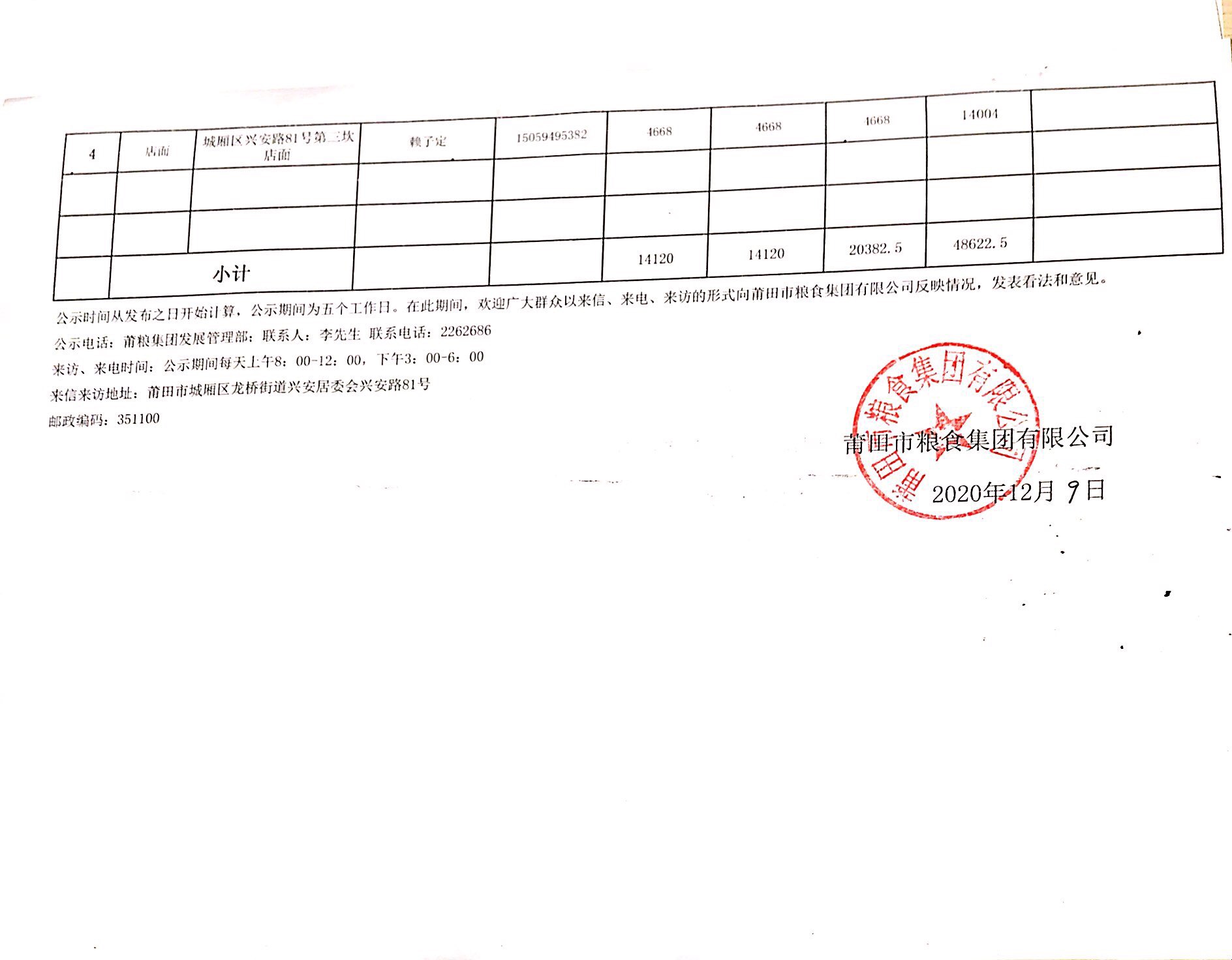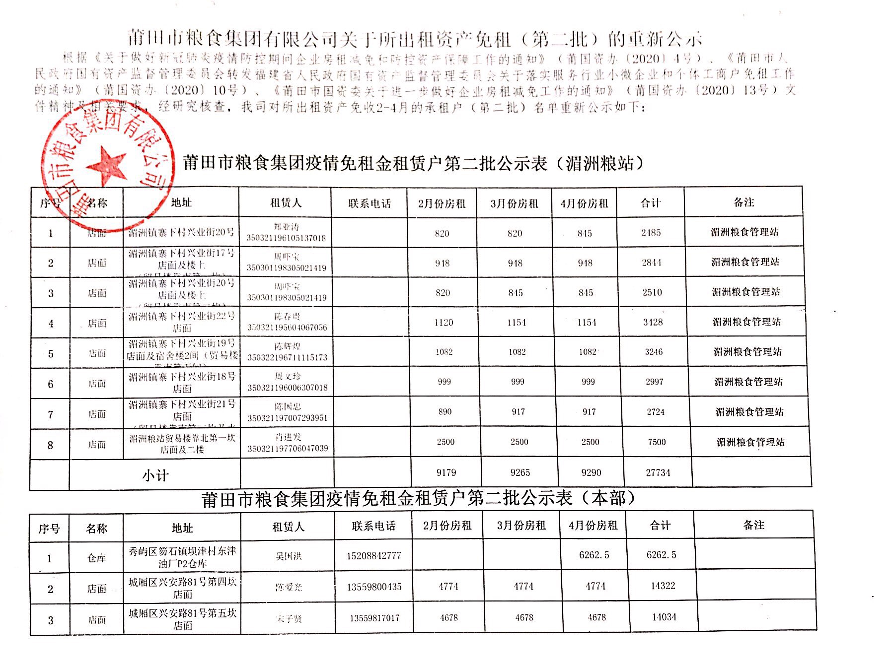 莆田市粮食集团有限公司关于所出资资产免租(第二批)的重新公示