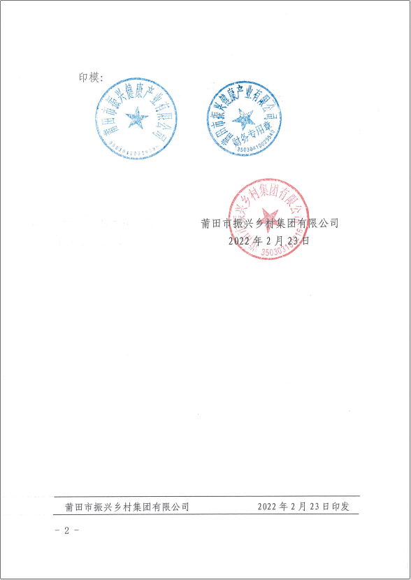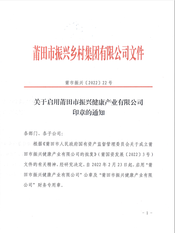 关于启用莆田市振兴健康产业有限公司印章的通知