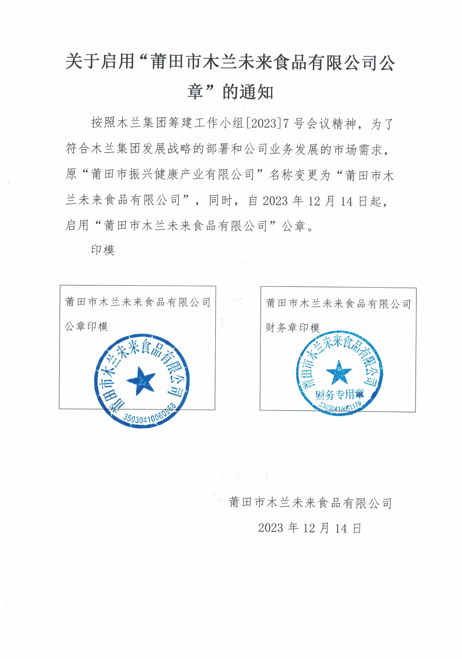 关于启用“莆田市木兰未来食品有限公司公章”的通知