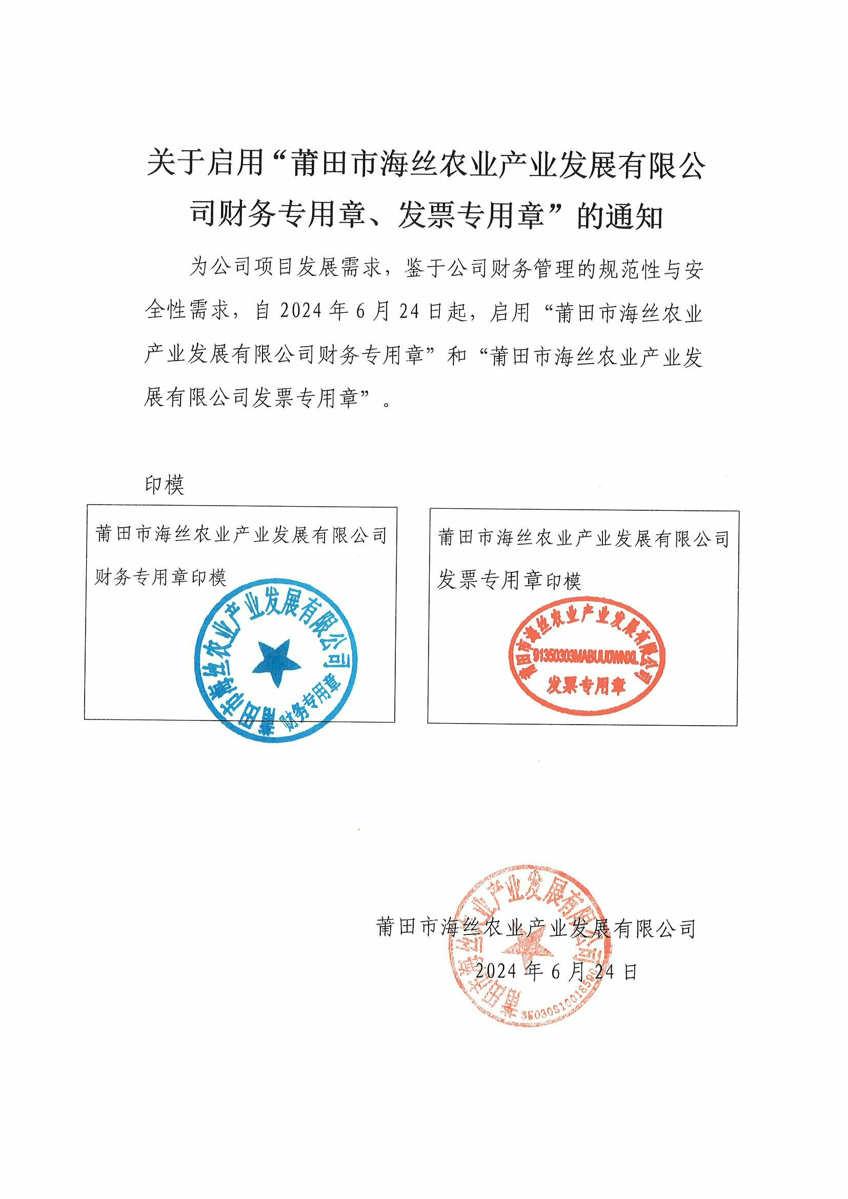 关于启用“莆田市海丝农业产业发展有限公司财务专用章、发票专用章”的通知